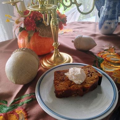 Perfect for October and cooling temps! Use a loaf pan (8-9 inch long), greased and floured. Mix in a large bowl: 2 eggs, 1 cup of pumpkin (I use canned pumpkin: not the pie mix nor puree)' 1/2 cup canola oil, 1/2 cup water. Add sugar: I don't like this too sweet so I use 2/3 cup white sugar and 1/3 cup honey. Mix everything so far on this list. Now measure dry ingredients: 1 2/3 cup flour + 1 teaspoon baking soda + 1/5 teaspoon baking powder+ 1/2 teaspoon ground cloves+ 1/2 teaspoon cinnamon+ 1/4 teaspoon pumpkin pie spice and 1/4 teaspoon nutmeg+ a dash of salt. Add the mixture of dry ingredients to the wet. Stir in 1 teaspoon vanilla extract, 1/3 cup of white chocolate chips, some chopped dried cranberries or dates (amount varies: I use about 1/8 to 1/4 cup) and a small handful of chopped pecans or walnuts. Stir all together. Batter will be thick but 'pourable'. Pour batter into the prepared loaf pan, Bake for one hour at 350 degrees. Your kitchen is going to smell great!