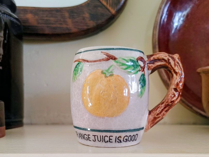 After World War II, Japan produced various patterns of Napcoware (National Potteries Corporation). This cup for drinking orange juice was mine from childhood, around 1958-1960,