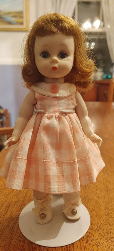 Here is a classic 8 inch Wendy/Alexander-kins, bent knees, strung doll, made between 1954 and 1956. She is not a 'walker', and she has brush lashes and slightly curved arms. She was given to me when I was two years old or so. I actually dropped and broke her, and my mother packed her in a box and sent her to the 'doll hospital'. It took a month or so, until she came back to me, good as new.