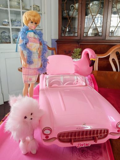 Barbie with her famous pink French Poodle and the classic 1960s Chevy Corvette Stingray, also in pink!
