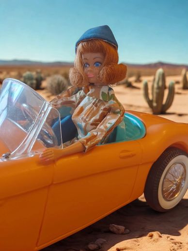 Midge driving the classic Austin Healey in Arizona!